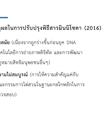 เหตุผลในการปรับปรุงพิธีสารมินนิโซตา (2016) • ล้าสมัย (เนื่องจากถูกร่างขึ้นก่อนยุค DNA เทคโนโลยีการถ่ายภาพดิจิทัล และการพัฒนา กฎหมายสิทธิมนุษยชนอื่นๆ) • ความไม่สมบูรณ์ (การให้ความส่าคัญแค่กับ คณะกรรมการไต่สวนในฐานะกลไกหลักในการ ตรวจสอบ)