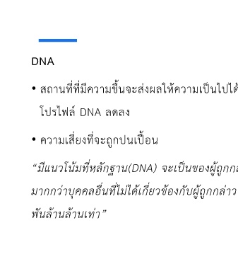 DNA • สถานที่ที่มีความชื้นจะส่งผลให้ความเป็นไปได้ที่จะสร้าง โปรไฟล์ DNA ลดลง • ความเสี่ยงที่จะถูกปนเปื้อน “มีแนวโน้มที่หลักฐาน(DNA) จะเป็นของผู้ถูกกล่าวหา มากกว่าบุคคลอื่นที่ไม่ได้เกี่ยวข้องกับผู้ถูกกล่าวหาถึง 11.8 พันล้านล้านเท่า”