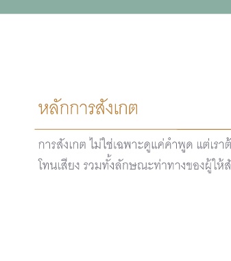 หลักการสังเกต การสังเกต ไม่ใช่เฉพาะดูแค่คําพูด แต่เราต้องดูภาษากายต่าๆ สีหน้า โทนเสียง รวมทัCงลักษณะท่าทางของผู้ให้สัมภาษณ์ 10
