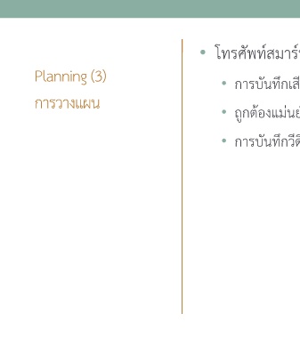 • โทรศัพท9สมาร9ทโฟน Planning (3) • การบันทึกเสียงได;งIายกวIา การวางแผน • ถูกต;องแมIนยำ ตรวจสอบการแปลภาษา • การบันทึกวีดีโอมีป^ญหามากกวIา 17