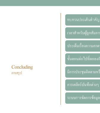 ทบทวนประเด็นสําคัญ เวลาสําหรับผู้ถูกสัมภาษณ์ในการถามคําถาม ประเด็นเรื=องความคาดหวัง ขัAนตอนต่อไปที=ตกลงกัน Concluding การสรุป มีการประชุมติดตามหรือไม่ การเคลียร์บันทึกต่างๆ ให้ชัดเจน ระบบการจัดการข้อมูล