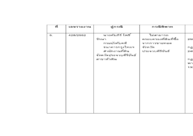กรณีพิพาท การปฏิบัติต่อปัญหา ลักษณะปัญหา นโยบายและ กฎหมาย 1. 2 กันยายน 2546 ผู้ร้อง 1. ที่ดิน น.ส.3 ก เลขที่ 1464 เนื้อที่ รัฐธรรมนูญ ไม่สามารถ แจ้งความที่สถานีตํารวจภูธรเมือง 36-2-86 ไร่ ผู้ร้องซื้อโดยดูจากสถานที่ 2550 มาตรา 41 ครอบครองที่ดินที่ซื้อ 2. ผู้ร้องสอบถามที่กรมบังคับ จริง