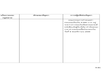 9‐81 การปฏิบัติต่อปัญหา คณะกรรมการกําหนดค่า ทดแทนเป็นเงิน 8,580 บาท อยู่ ระหว่างการขอเงินจัดสรรและจะมี หนังสือแจ้งผู้ร้องให้มาทําข้อตกลง ราคาค่าทดแทนขั้ นปรองดองใน วันที่ 8 พฤศจิกายน 2548 ลักษณะปัญหา นโยบายและ กฎหมาย กรณีพิพาท คู่กรณี เลขรายงาน ที่