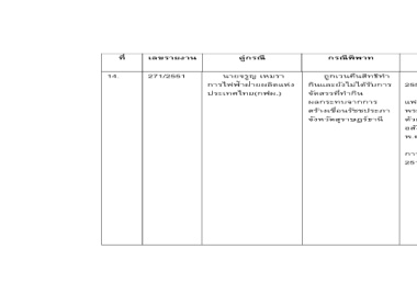 กรณีพิพาท การปฏิบัติต่อปัญหา ลักษณะปัญหา นโยบายและ กฎหมาย 1. 18 พฤศจิกายน 2547 ผู้ 1. ผู้ร้องมีที่ดินทํากิน ภ.บ.ท.5 ถูก รัฐธรรมนูญ ถูกเวนคืนสิทธิทํา ร้องร้องเรียนต่อนายอําเภอผ่าน อพยพจากที่ทํากินเดิมเพราะนํ้าท่วมที่ทํา 2550 มาตรา 41, 42 กินและยังไม่ได้รับการ ผู้ใหญ่บ้านหลังจากที่พบเอกสาร กิ
