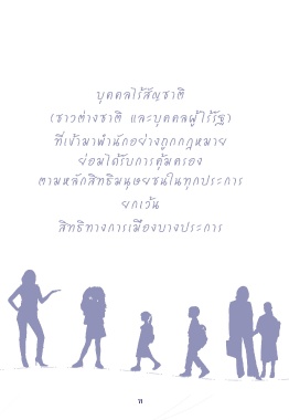บุคคลไร้สัญชาติ (ชาวต่างชาติ และบุคคลผู้ไร้รัฐ) ที่เข้ามาพํำานักอย่างถูกกฎหมาย ย่อมได้รับการคุ้มครอง ตามหลักสิทธิมนุษยชนในทุกประการ ยกเว้น สิทธิทางการเมืองบางประการ ท