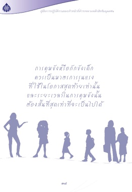 คู่มือการปฏิบัติงานของเจ้าหน้าที่ตำารวจตามหลักสิทธิมนุษยชน การคุมขังหรือกักขังเด็ก ควรเป็นมาตรการรุนแรง ที่ใช้ในโอกาสสุดท้ายเท่านั้น และระยะเวลาในการคุมขังนั้น ต้องสั้นที่สุดเท่าที่จะเป็นไปได้ 38