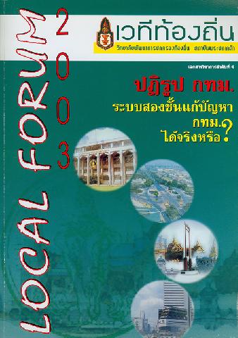 เวทีท้องถิ่น : ปฏิรูป กทม. : ระบบสองชั้นแก้ปัญหา กทม. ได้จริงหรือ / วิทยาลัยพัฒนาการปกครองท้องถิ่น สถาบันพระปกเกล้า ; คณะผู้จัดทำ วุฒิสาร ตันไชย, สุมามาลย์ ชาวนา และ อติพร แก้วเปีย