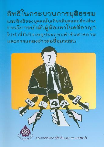 245 00 ^aสิทธิในกระบวนการยุติธรรมและสิทธิของบุคคลในเกียรติยศและชื่อเสียง กรณีการนำตัวผู้ต้องหาในคดีอาญาไปนำชี้ที่เกิดเหตุประกอบคำรับสารภาพและการแถลงข่าวต่อสื่อมวลชน/^cคณะอนุกรรมการสิทธิมนุษยชนด้านกฎหมายและการปฏิบัติที่ไม่เป็นธรรม