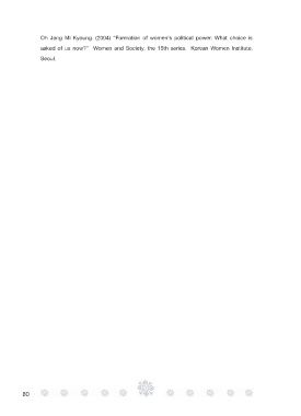 Oh Jang Mi Kyoung. (2004) çFormation of womenûs political power: What choice is asked of us now?é Women and Society, the 15th series. Korean Women Institute, Seoul. 80