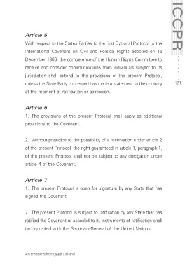 Page 122 - หลักกฎหมายระหว่างประเทศทั่วไปเกี่ยวกับสนธิสัญญาด้านสิทธิมนุษยชน, กติการะหว่างประเทศว่าด้วยสิทธิพลเมืองและสิทธิทางการเมือง