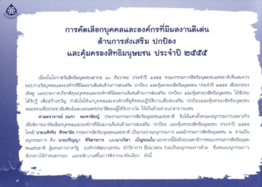 Page 12 - รางวัลเกียรติยศ "ผู้อุทิศตนเพื่อสิทธิมนุษยชน" บุคคลและองค์กรที่มีผลงานดีเด่นด้านการส่งเสริม ปกป้อง และคุ้มครองสิทธิมนุษยชน ประจำปี 2555