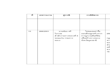 กรณีพิพาท การปฏิบัติต่อปัญหา ลักษณะปัญหา นโยบายและ กฎหมาย 3. 21 มกราคม 2548 เจ้า กรมทางหลวงชนบทไม่ชอบ พนักงานเวนคืนพร้อมด้วยตํารวจ ได้ทําการรื้อถอนพื้นที่พิพาท โดย ผู้ร้องยังไม่ได้รับค่าทดแทนการ เวนคืน 1. ผู้ใหญ่บ้านทําหนังสือถึง 1. ผู้ร้องอยู่อาศัยบนที่ดิน น.ส.3 ก รัฐธรรมนูญ ไม่ชดเ