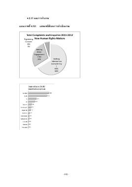 4.5.11 ผลการท างาน แผนภาพที่ 4.12: แสดงสถิติผลการด าเนินงาน Total Complaints and Enquiries 2011-2012 New Human Rights Matters Registering Concern 302 5% Seeking Other Engagement 1784 29% Seeking Intervention (complaining ) 4061 66% - 115 -