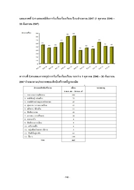 แผนภาพที่ 5.4 แสดงสถิติการรับเรื่องร้องเรียน ปี งบประมาณ 2547 (1 ตุลาคม 2546 – 30 กันยายน 2547) ตารางที่ 5.4 แสดงการสรุปการรับเรื่องร้องเรียน ระหว่าง 1 ตุลาคม 2546 – 30 กันยายน 2547 จ าแนกตามประเภทพของสิทธิเสรีภาพที่ถูกละเมิด - 142 -