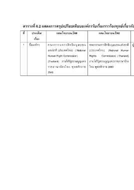 ตารางที่ 6.2 แสดงการสรุปเปรียบเทียบองค์กรรับเรื่องราวร้องทุกข์เกี่ยวกับการละเมิดสิทธิมนุษยชนในประเทศไทย
