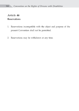 146 Convention on the Rights of Persons with Disabilities Article 46 Reservations 1. Reservations incompatible with the object and purpose of the present Convention shall not be permitted. 2. Reservations may be withdrawn at any time.