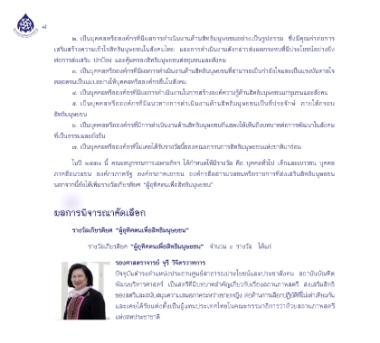๖. เป็นบุคคลหรือองค์กรที่มีการดำาเนินงานด้านสิทธิมนุษยชนที่แสดงให้เห็นถึงบทบาทต่อการพัฒนาในสังคม