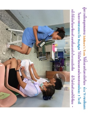 ผู้ตรวจถือสมุดทดสอบ Ishihara’s Tests ให้ตั้งฉากกับตานักเรียน ห่าง 75 เซนติเมตร ในสภาพแสงกลางวัน Daylight ให้นักเรียนมองแผ่นทดสอบแผ่นละ 3 วินาที แล้วให้นักเรียนเขียนตัวเลขที่มองเห็นในแบบบันทึก ถ้าไม่เห็นตัวเลขให้เขียน -