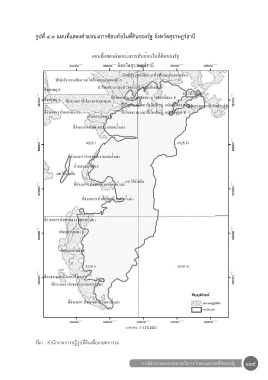 รูปที่ 4.9 แผนที่แสดงต�าแหน่งการซ้อนทับในที่ดินของรัฐ จังหวัดสุราษฎร์ธานี ที่มา : สำานักงานการปฏิรูปที่ดินเพื่อเกษตรกรรม การมีส่วนร่วมของประชาชนในการกำาหนดแนวเขตที่ดินของรัฐ 165
