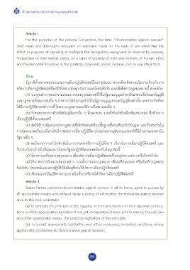 รัฐภาคีทั้งหลายขอประณามการเลือกปฏิบัติต่อสตรีในทุกรูปแบบ ตกลงที่จะติดตามนโยบายเกี่ยวกับการ