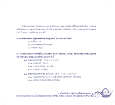 ๒. รางวัลบุคคลและองค์กรที่มีผลงานดีเด่นด้านการส่งเสริม ปกป้อง และคุ้มครองสิทธิมนุษยชน