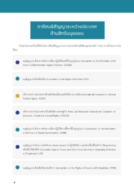 ปัจจุบันประเทศไทยได้เข้าเป็นภาคีสนธิสัญญาระหว่างประเทศด้านสิทธิมนุษยชนหลัก 7 ฉบับ จากทั้งหมด 9 ฉบับ