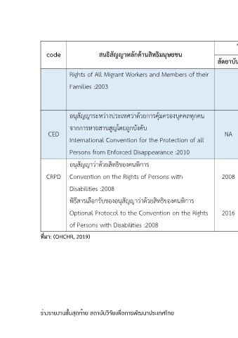 สนธิสัญญาหลักด้านสิทธิมนุษยชน Rights of All Migrant Workers and Members of their อนุสัญญาระหว่างประเทศว่าด้วยการคุ้มครองบุคคลทุกคน International Convention for the Protection of all Persons from Enforced Disappearance :2010 Convention on the Rights of Persons with พิธีสารเลือกรับของอนุสัญญาว่าด้วยสิทธิของคนพิการ Optional Protocol to the Convention on the Rights