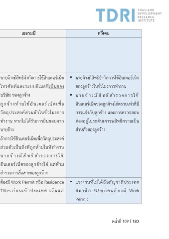 สวีเดน ▫ นายจ้างมีสิทธิจำกัดการใช้อินเตอร์เน็ต อินเตอร์เน็ตของลูกจ้างได้ตราบเท่าที่มี การแจ้งกับลูกจ้าง และการตรวจสอบ ต้องอยู่ในระดับเคารพสิทธิความเป็น ▫ แรงงานที่ไม่ได้ถือสัญชาติประเทศ สมาชิก EU ทุกคนต้องมี Work หน้าที่ 109 | 180