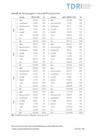 ตารางที่ 14 ปริมาณและมูลค่าการส่งออกสัตว์ปีกแปรรูปของไทย