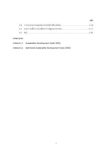 หน้า 6.4 การกระจายภาระและผลประโยชน์ทางสิ่งแวดล้อม 6-14 6.5 มาตรการเพื่อความร่วมมือระหว่างรัฐและประชาชน 6-17 6.6 สรุป 6-20 บรรณานุกรม ภาคผนวก 1: Sustainable Development Goals (SDG) ภาคผนวก 2: เอกสารแปล Sustainable Development Goals (SDG) iii