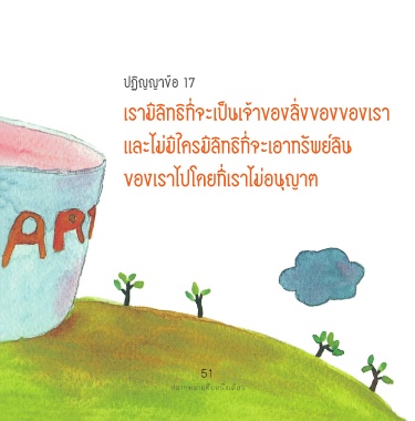ปฏิญญาข้อ 17 เรามีสิทธิที่จะเป็นเจ้าของสิ่งของของเรา เเละไม่มีใครมีสิทธิที่จะเอาทรัพย์สิน ของเราไปโดยที่เราไม่อนุญาต 51 หลากหลายคือหนึ่งเดียว
