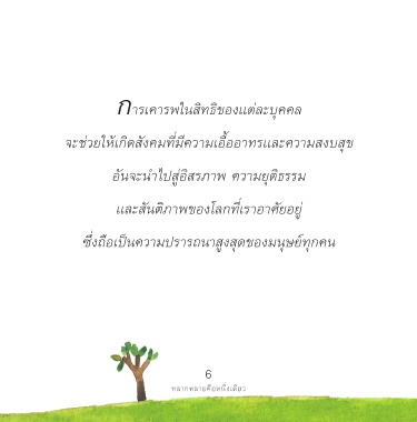 การเคารพในสิทธิของเเต่ละบุคคล จะช่วยให้เกิดสังคมที่มีความเอื้ออาทรเเละความสงบสุข อันจะนำไปสู่อิสรภาพ ความยุติธรรม เเละสันติภาพของโลกที่เราอาศัยอยู่ ซึ่งถือเป็นความปรารถนาสูงสุดของมนุษย์ทุกคน 6 หลากหลายคือหนึ่งเดียว