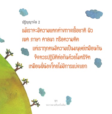 ปฏิญญาข้อ 2 เเม้เราจะมีความเเตกต่างทางเชื้อชาติ ผิว เพศ ภาษา ศาสนา หรือความคิด เเต่เราทุกคนมีความเป็นมนุษย์เหมือนกัน จึงควรปฏิบัติต่อกันด้วยไมตรีจิต เหมือนพี่น้องโดยไม่มีการเเบ่งเเยก 11 หลากหลายคือหนึ่งเดียว