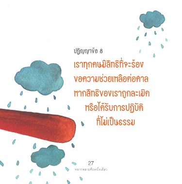 ปฏิญญาข้อ 8 เราทุกคนมีสิทธิที่จะร้อง ขอความช่วยเหลือต่อศาล หากสิทธิของเราถูกละเมิด หรือได้รับการปฏิบัติ ที่ไม่เป็นธรรม 27 หลากหลายคือหนึ่งเดียว