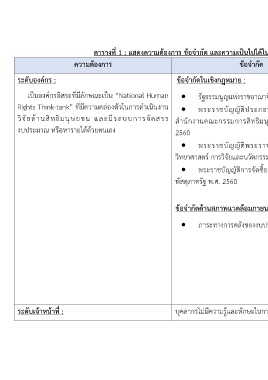 ตารางที่ 1 : แสดงความตองการ ขอจํากัด และความเปนไปไดในการจัดตั้งสถาบันพัฒนาระบบและองคความรูดานสิทธิมนุษยชน
